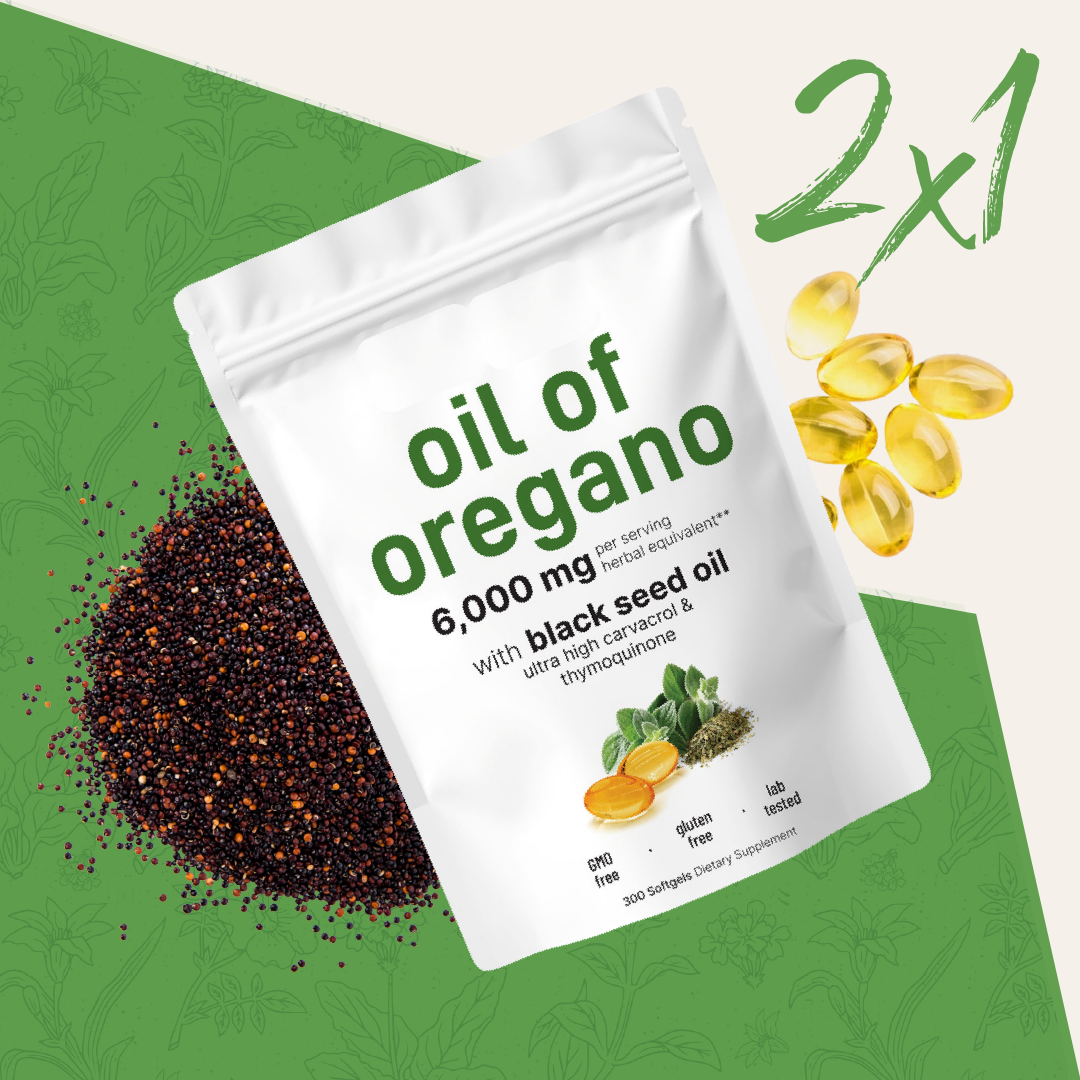 6000 mg de aceite de orégano rico en carvacrol y 200 mg de semilla negra con timoquinona.