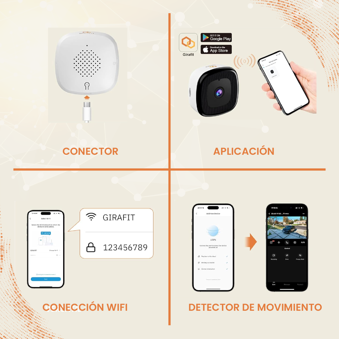 Detección de movimiento, alerta instantánea a tu celular, visión nocturna a color, y lo mejor… ¡una alarma que suena con solo un toque!