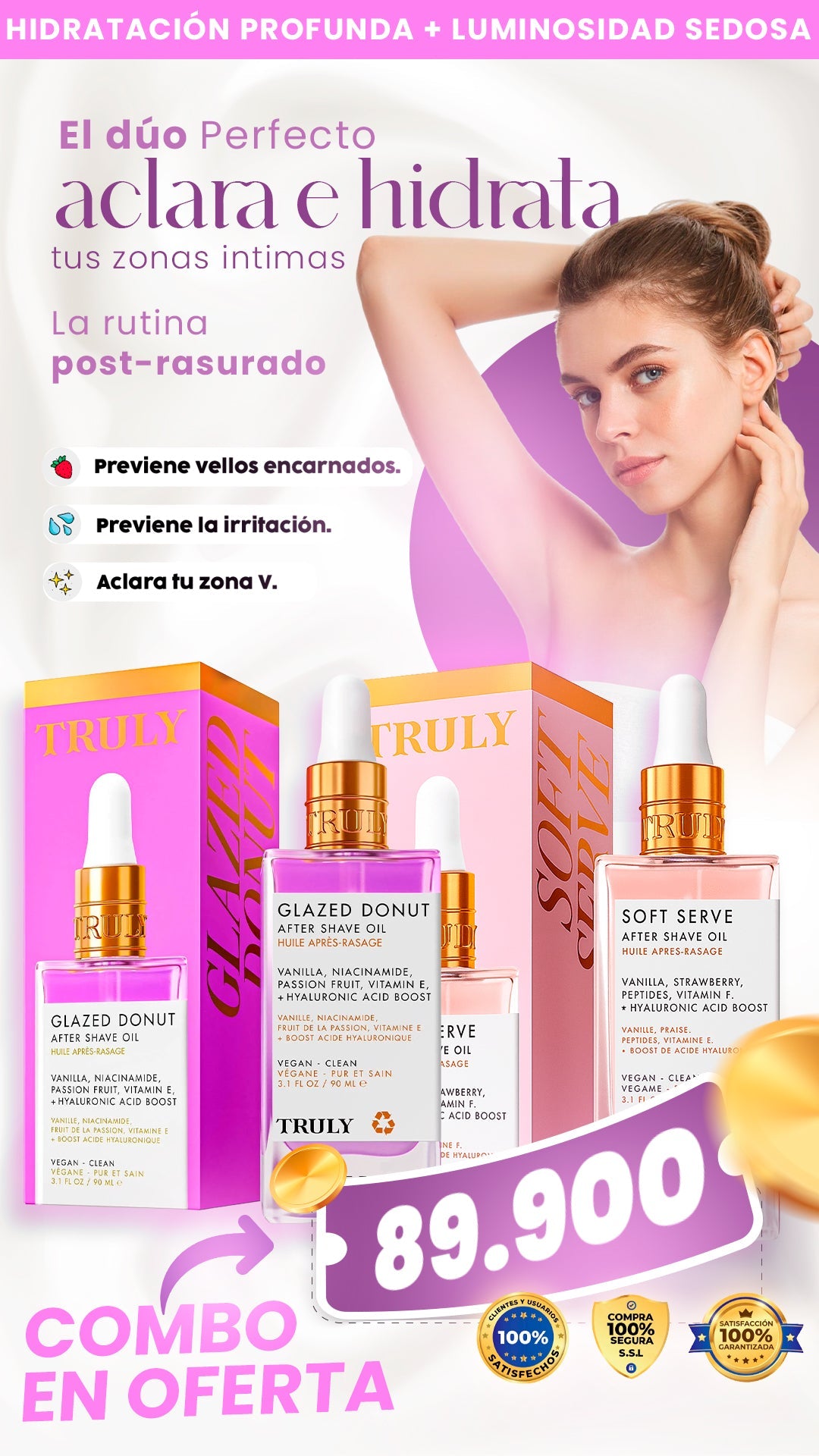 Con el uso constante de el aceite Truly, se reduce visiblemente la pigmentación en zonas sensibles y se previenen los vellos encarnados, dejando la piel más uniforme.