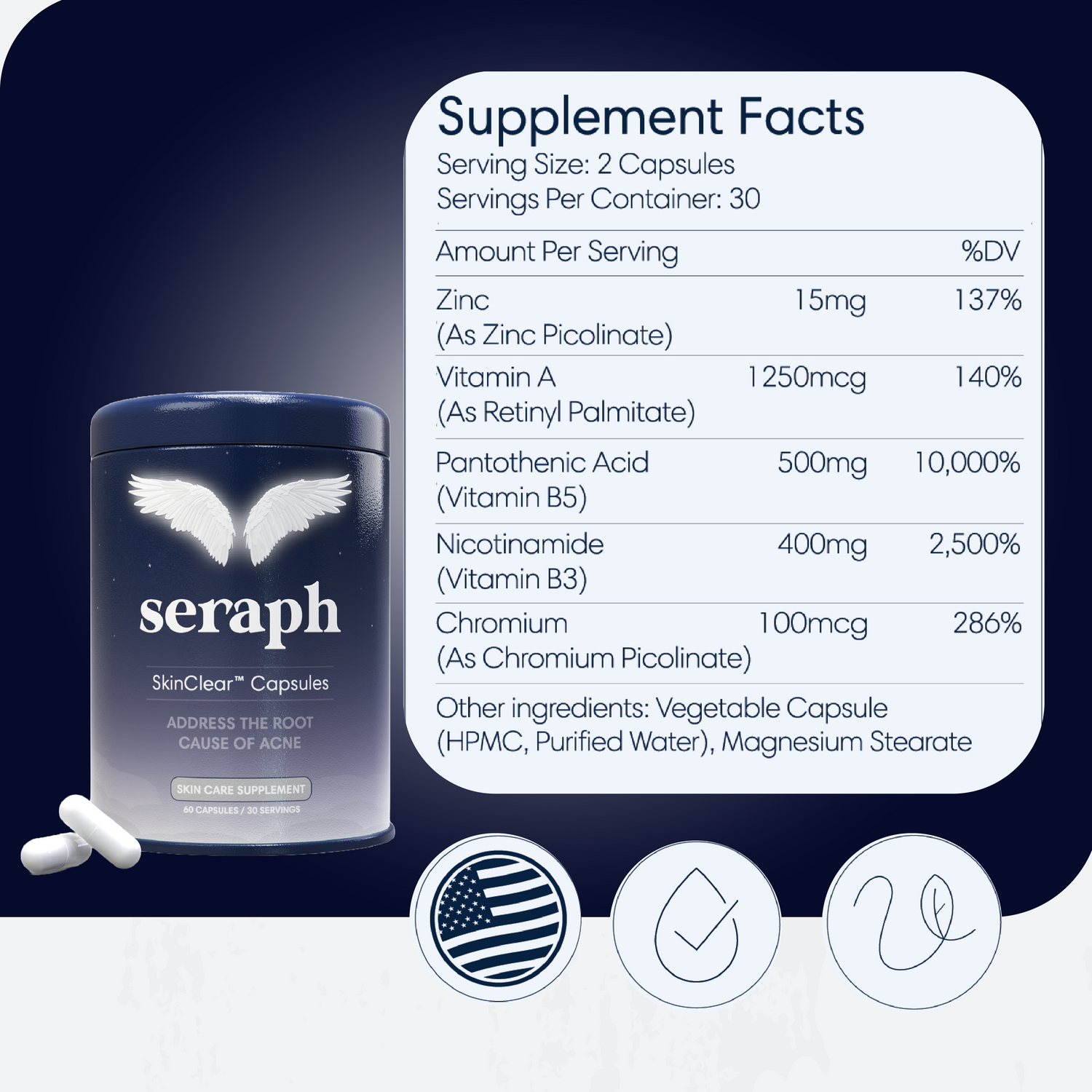 Con Seraph, solo necesitas 2 cápsula al día para empezar a ver resultados reales: menos brotes, menos grasa, menos manchas, y más confianza.