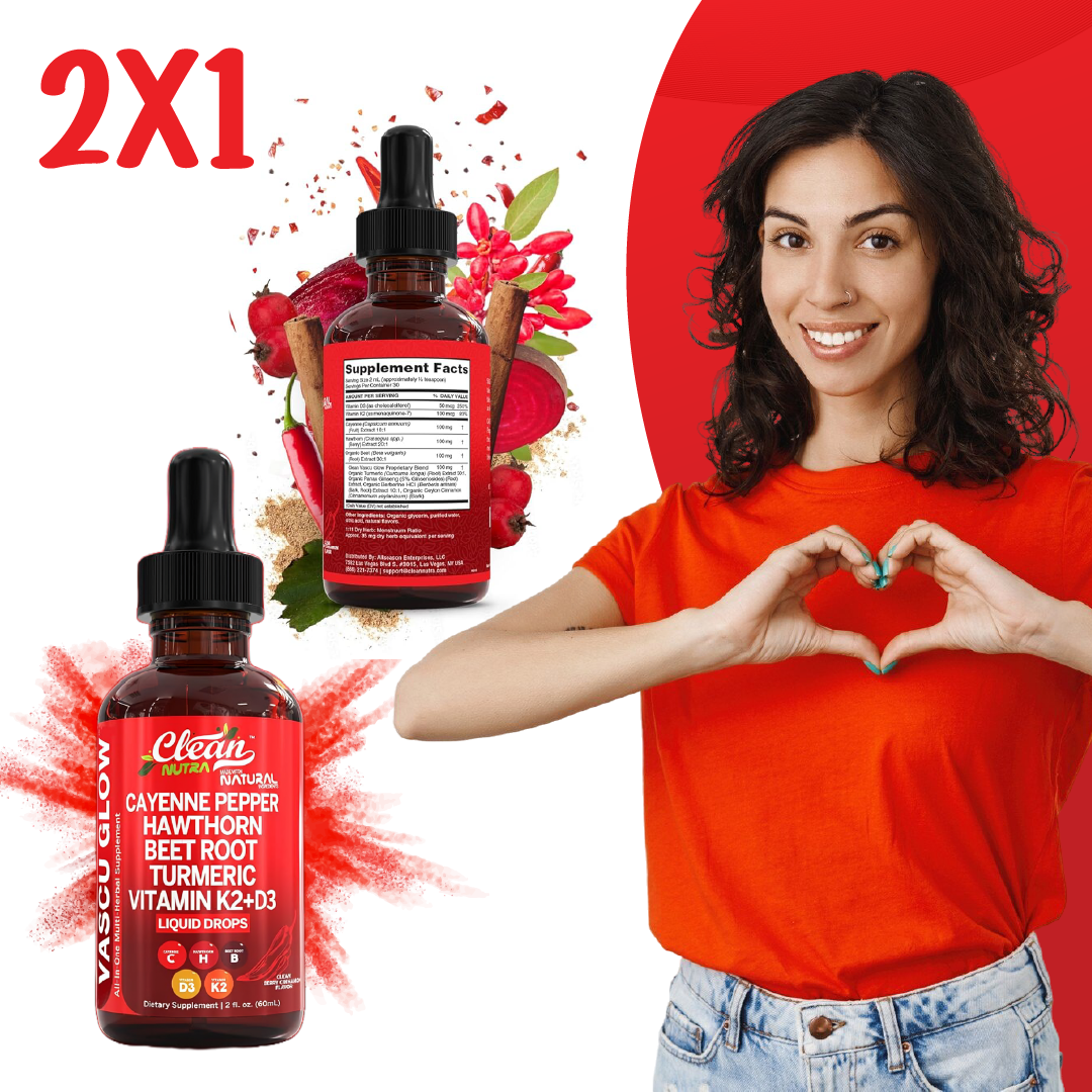 Vascu Glow con ingredientes naturales que promueven la elasticidad vascular y un flujo óptimo, protege tu sistema cardiovascular y mejora tu bienestar.